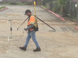 Utility locators may be operated in either active or passive mode. Passive locating is possible when electrically conductive conduits are energized by ambient radio frequencies (RF) that are often produced by 50/60 cycle electrical, radio, audio, television, and communication transmissions. Active locating is initiated by connecting to an exposed conduit and propagating an EM signal at a known frequency (8 and 33 kHz for example) along the conduit. A receiver, tuned to these frequencies, is then used to locate the signal maxima (or surface trace) of the applied signal. Spectrum uses a Radio Detection 7000 transmitter w/ matched receiver, Fisher TW-6 M-scope shallow focus metal detector (M-Scope), and Dynatel 500A transmitter w/ matched receiver, among other instruments, for utility location. Once located, utilities are marked on the ground with surveyor’s chalk using the American Public Works Association color code found below.