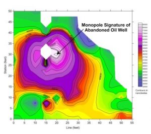 The magnetics method is a surface method that uses the response of either magnetic materials or atomic particles to an external magnetic field in order to measure the lateral variation in the intensity of the earth’s magnetic field. Because of its sensitivity to ferromagnetic (steel) objects and its great depth of detection, the most common shallow use for this method is to detect buried steel objects, such as USTs, abandoned steel-cased wells and steel piping. However, this method can also be useful for the lateral delineation of certain types of igneous bedrock, and so may be used to identify lateral geologic contacts as well as structural features in these rocks under certain conditions. The magnetics method is particularly useful where there is a large area to investigate, as an extremely large number of measurements can be made quickly and cost effectively.