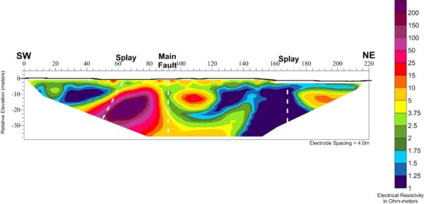 Once several high-conductivity EM-31 anomalies were identified, the depth of these anomalies was investigated along four DC resistivity transects using AGI’s Sting/Swift electrical resistivity system, four-meter cable and arrays of between 28 and 56 electrodes. The electrical resistivity data revealed several shallow extremely low resistivity anomalies which were further investigated by the Client in order to correlate resistivity values with subsurface features.